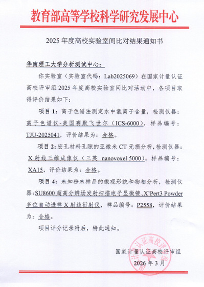 国家计量认证高校评审组近日公布了2025年度高校实验室间比对的结果。本次比对共设四个项目,分析测试中心参加了其中三个项目:“离子色谱法测定水中氯离子含量”、“宏孔材料孔隙的亚微米 CT 无损分析”和“未知粉末样品的微观形貌和物相分析”,并在此次比对活动中表现优异,全部获得 “合格(满意)” 结果。