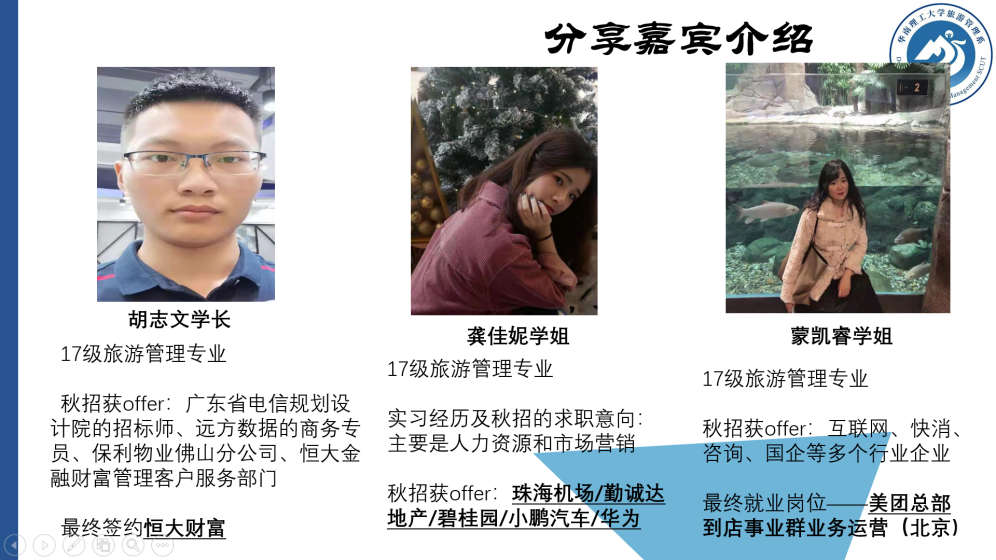 1月13日晚7点,我系在腾讯会议平台举行了“星光不问赶路人”首期分享会——“2021届秋季招聘旅管学子分享沙龙”。分享会邀请了三位在2021届秋季校园招聘中收获颇丰的毕业班同学进行求职经验分享与交流。