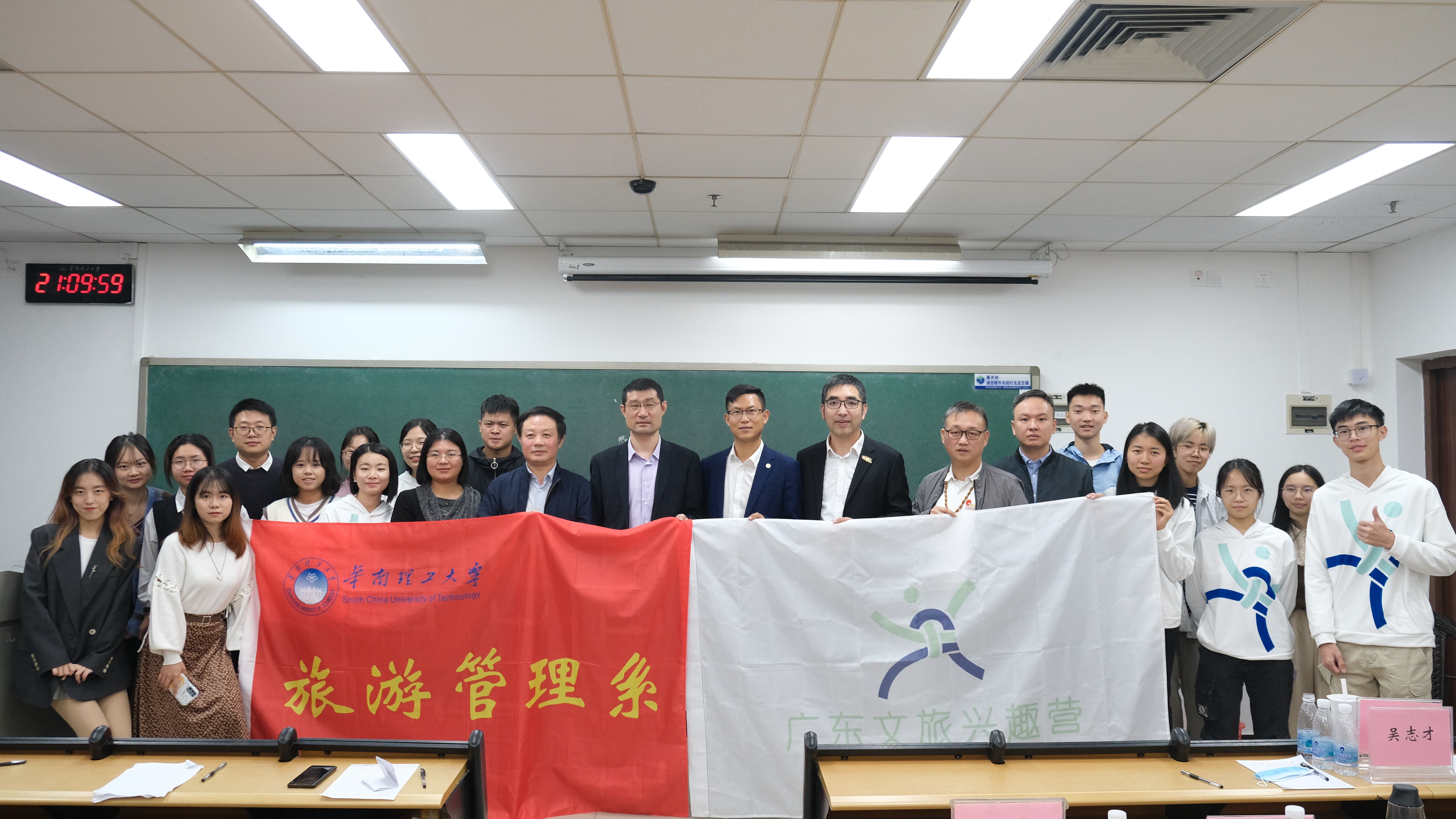 2021年11月25日(周四)晚上,“文旅微讲堂——广东文旅兴趣营‘深享+’分享会进高校”活动在华南理工大学大学城教学区A4-206顺利举行。本次活动主题为“乡村呼唤年轻文旅人”,华南理工大学旅游管理系吴志才教授,广东省旅游协会副秘书长马亮,广东省动漫协会秘书长敖刚敏,广东文旅兴趣营导师韩进,广州帷幕开啦蜡像馆馆长潘敏斌,文旅兴趣营营长吴丹及学员,华南理工大学旅游管理系学生工作负责人和辅导员也出席了本次讲座。