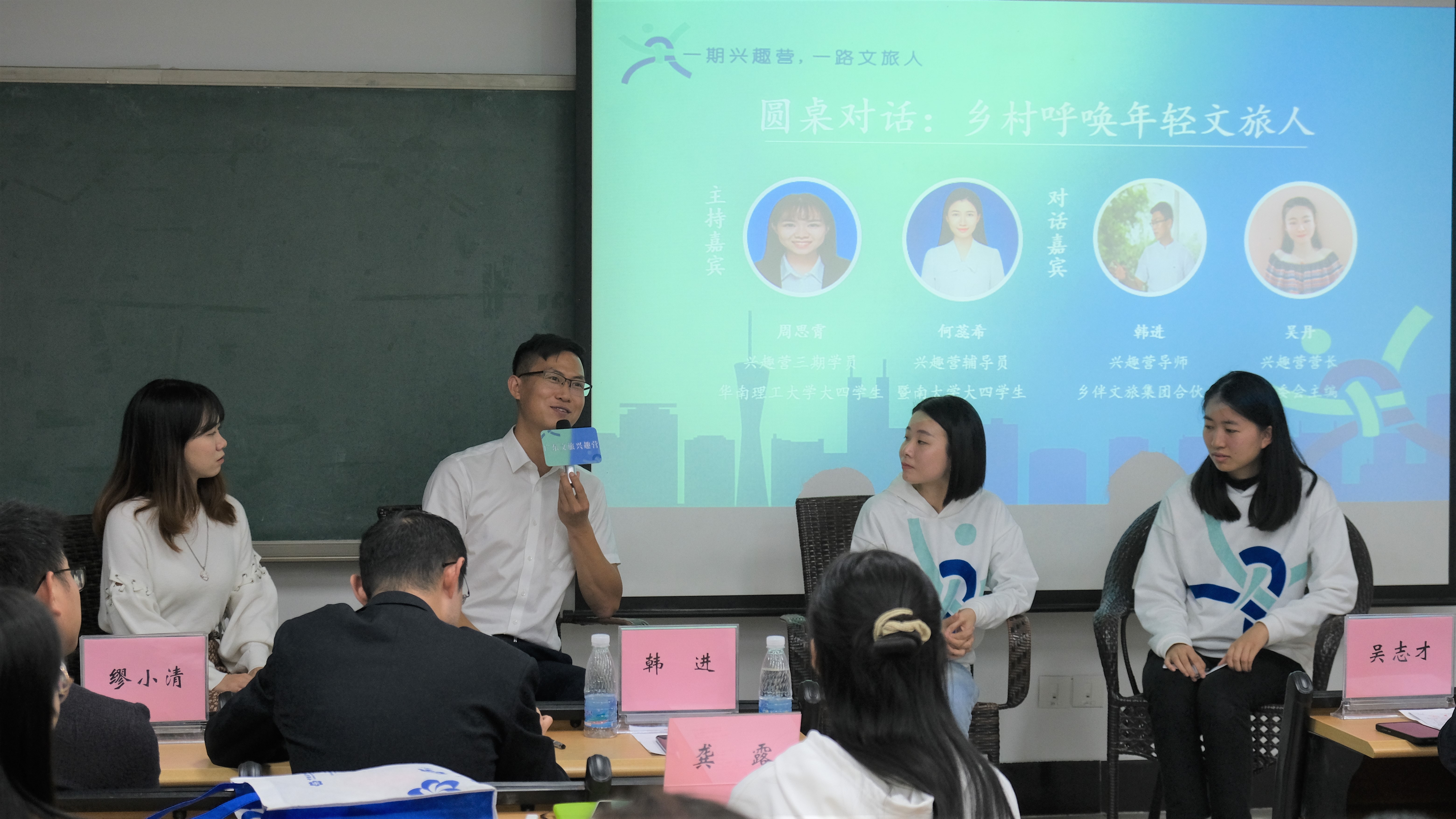 在圆桌对话环节,我系2018级本科生周思霄同学和兴趣营辅导员、暨南大学2018级何蕊希同学对话兴趣营导师、乡伴文旅集团合伙人韩进老师和兴趣营营长、专委会主编吴丹老师,进一步围绕“乡村呼唤年轻文旅人”进行深度探究讨论。韩进老师和吴丹主编分别从企业实践者和观察者的角度分析年轻文旅人为乡村带来的新生机,同时肯定了农村和年轻文旅人的双向吸引和双向选择。