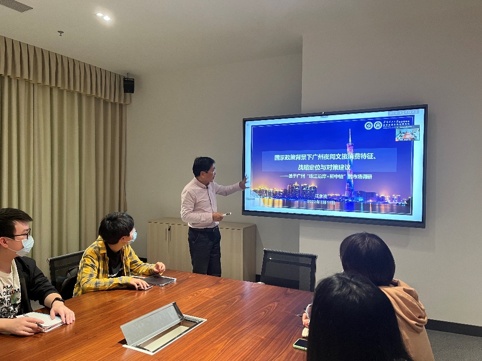 2022311日上午1040分,旅游管理系行政工作负责人江金波教授在华南理工大学广州国际校区D1-a538教室为本系全体研究生开展主题为“国家政策背景下广州夜间文旅消费特征、战略定位与对策建议——基于广州‘珠江沿岸+新中轴’的市场调研”的思政课程。为遵守疫情防控要求与便于所有硕博研究生参与,课程设置线上和线下两个课堂同时进行。