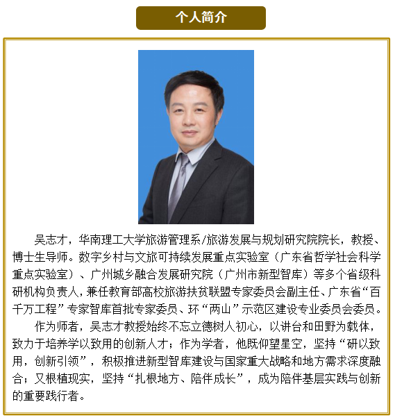 在智库决策方面。带领团队参与乡村振兴和文旅减贫事业近20年,形成多项具有较大影响力的政府决策咨询成果,30多项成果获国家、省级领导批示和地方政府采纳,其中广东省人民政府印发实施2项。作为广东省“百千万工程”专家智库首批专家委员,全面参与广东省“百千万工程”、环“两山”示范区建设等重大战略工作,形成良好的战略决策效应。在《人民日报》《光明日报》等“三报一刊”以及《南方日报》《广州日报》等地方“四报一刊”发表乡村振兴与文旅融合相关理论文章及采访报道近100篇。组织策划举办“乡村振兴大家谈”等精品学术沙龙活动,形成开放共享的智库生态,他用自己的实际行动,生动诠释了“把论文写在乡村大地上”的深刻内涵。