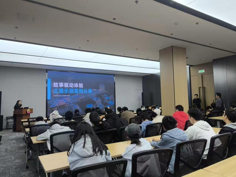 在随后的讲座环节,励丰文化资深创意策划师赵祯老师以“故事驱动体验”为主题,系统解析了“长隆宇宙飞船游乐园”从概念萌发到整体落地的全过程。讲座围绕“主题设定—世界观构建—场景细分—全馆整合”的逻辑展开。赵老师指出,在策划一个主题乐园时,需要以“故事罗盘”为工具将核心故事线索贯穿于动线设计、建筑景观、餐饮购物、员工服务等每一个细节,最后像导演一样,规划游客的情绪起伏,创造“峰值体验”与终值记忆。