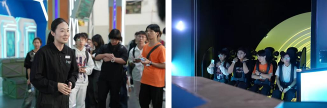 学子们亲身体验了智能手环和星跃之旅等带来的逼真互动乐趣,也体验了太空梯等惊险刺激的经典大型游乐设施。在游玩过程中,学子们随时随处都能感受到科技赋能的力量,各种技术的应用始终围绕“提升游客体验”展开——手环功能服务于互动玩法与情绪价值的增强,MR技术用于优化场景沉浸感,而非单纯追求技术的“高端感”。这让学子们明白,文旅科技的本质是“技术为载体,体验为核心”,只有游客的各项感官体验都得到充分地满足,才能让游客主观地愿意把科技所带来的虚假的真实当作真实。