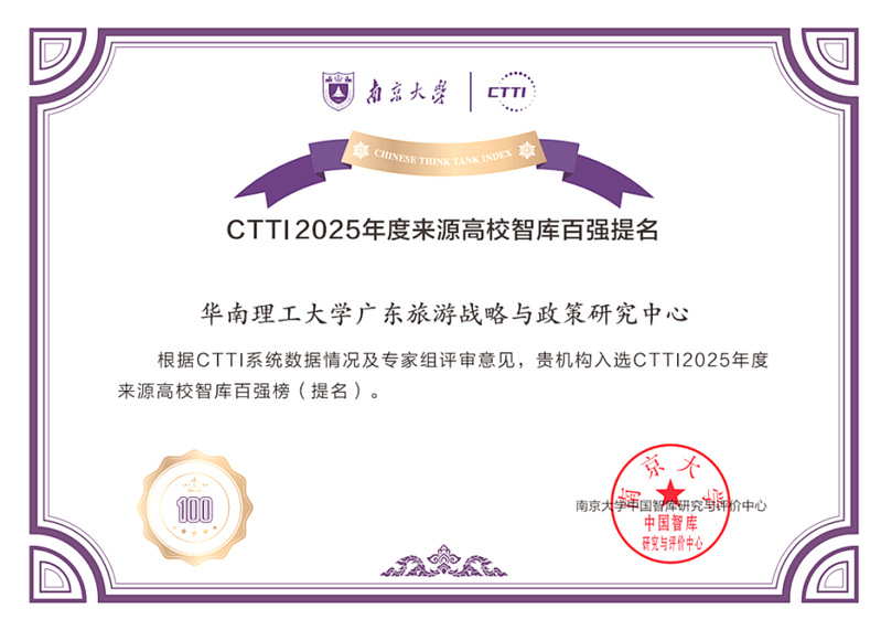 华南理工大学广东旅游战略与政策研究中心入选“CTTI2025年度高校智库百强榜”。