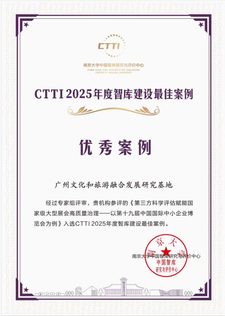 我系广州文化和旅游融合发展研究基地研究案例《第三方科学评估赋能国家级大型展会高质量治理——以第十九届中国国际中小企业博览会为例》获CTTI2025年度智库建设最佳案例优秀案例奖。
