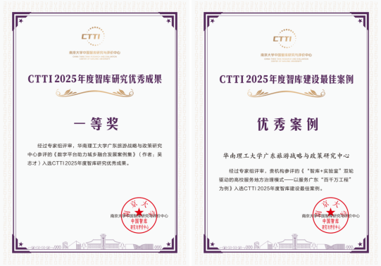 其中,我系华南理工大学广东旅游战略与政策研究中心研究成果《数字平台助力城乡融合发展案例集》获CTTI2025年度智库研究优秀成果一等奖;研究案例《“智库+实验室”双轮驱动的高校服务地方治理模式——以服务广东“百千万工程”为例》获CTTI2025年度智库建设最佳案例优秀案例奖。