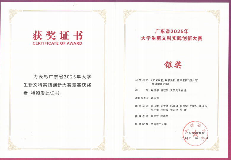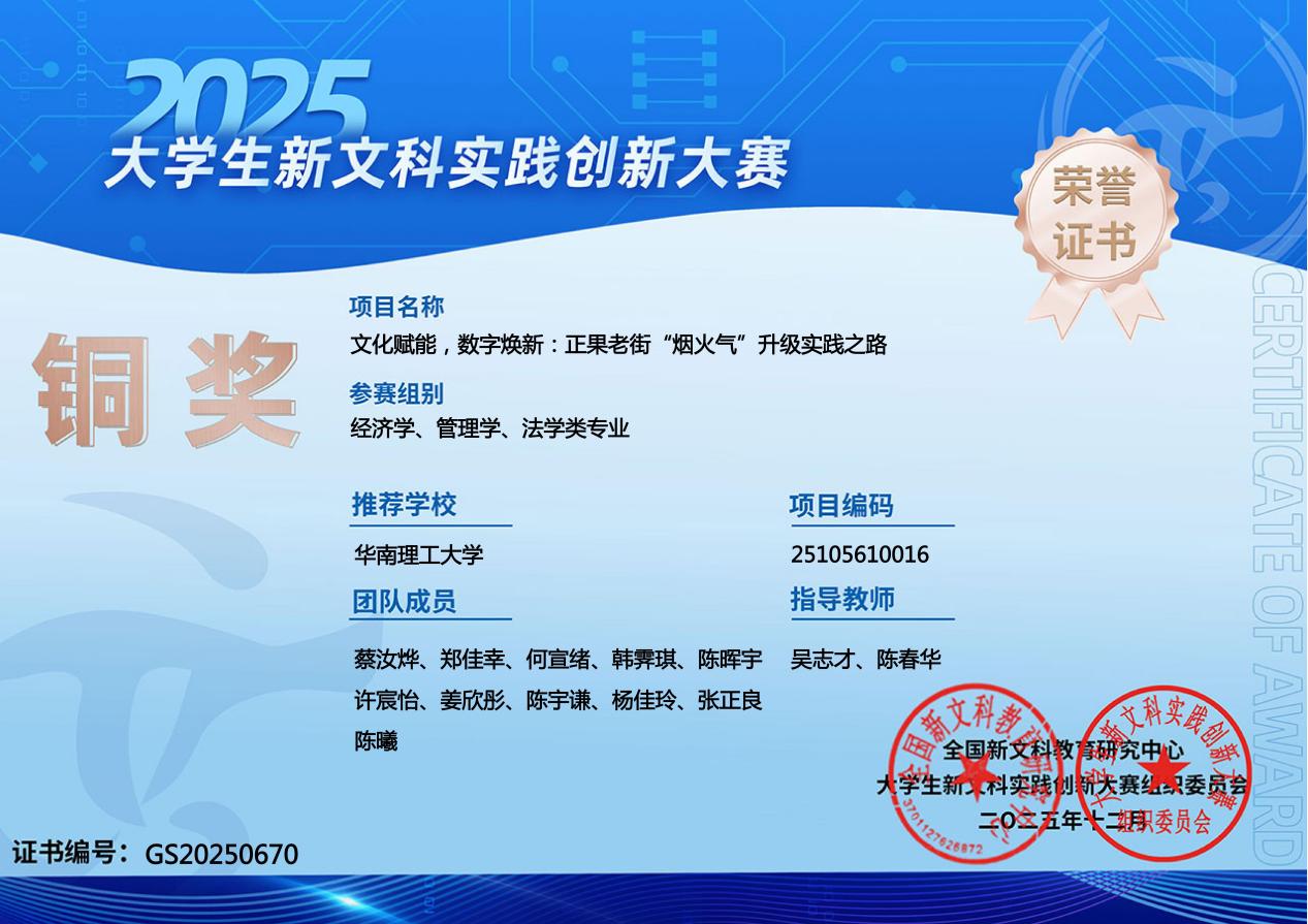 为深化高校实践创新教育改革,提升学生的创新思维和实践能力,推动新文科建设走深走实,近日全国新文科教育研究中心举办了“2025年大学生新文科实践创新大赛”。华南理工大学“文化赋能,数字焕新:正果老街的烟火气升级实践之路”项目凭借跨学科创新实力与扎实实践成果一路突围,斩获校赛金奖、省赛银奖及国赛铜奖,展现了华南理工大学旅游管理系在文旅融合与数字乡村建设领域的育人成果与实践突破。