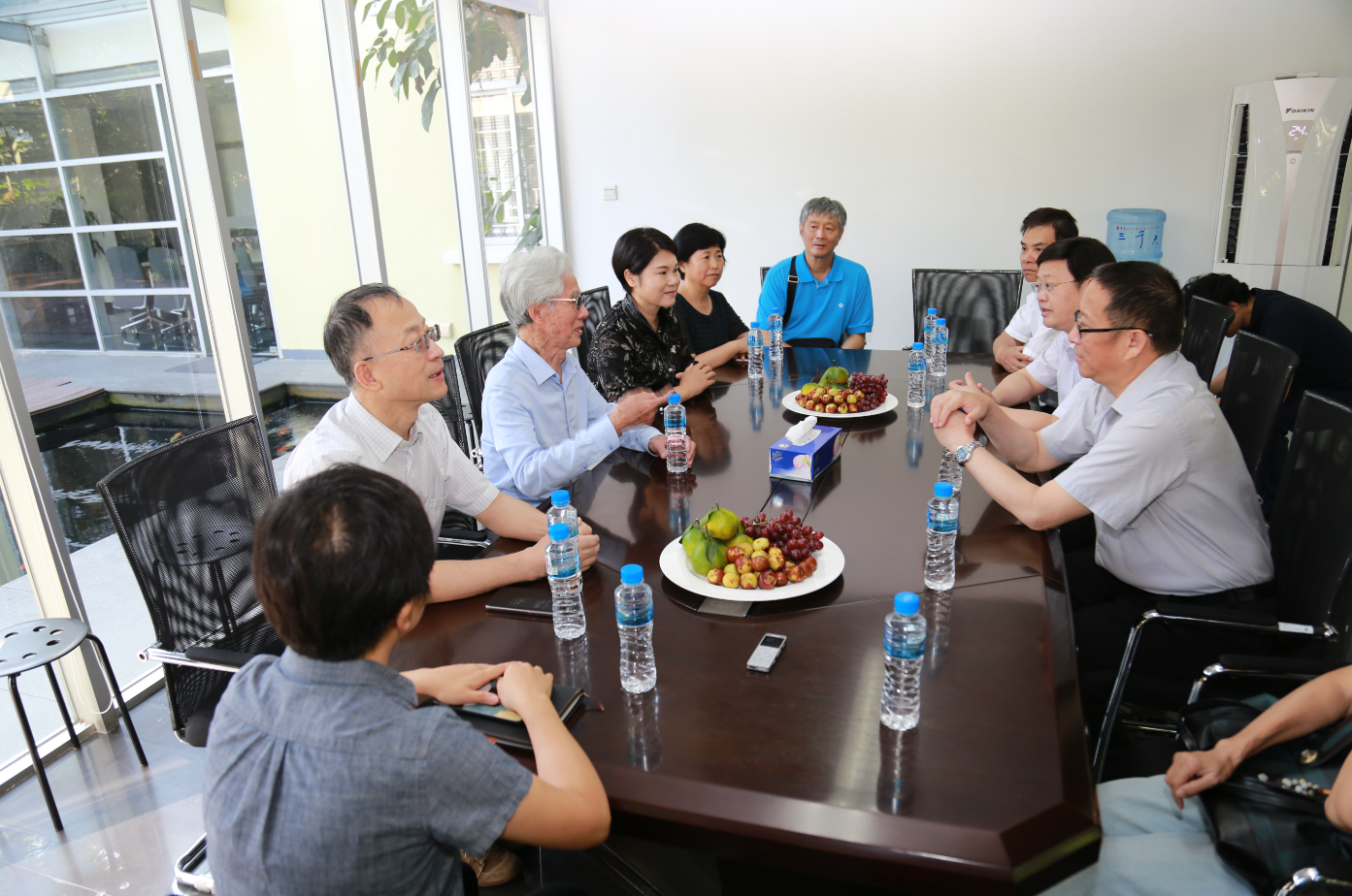 随后,调研组前往华南理工大学建筑学院院长何镜堂院士工作室参观。何院士亲自在展厅介绍了相关的工作成果,并表示中国建筑要强调文化自信,要不断的学习和探索,要体现中国的地域特色、文化特征和时代风貌。大家在轻松友好的氛围下进行了深入的交流。郑建邦副主席对何院士既汲取中国传统文化精髓,又创新时尚先锋的工作理念和实践表示敬佩,也期待能继续看到何院士更多的建筑杰作。(图/文 党委统战部)