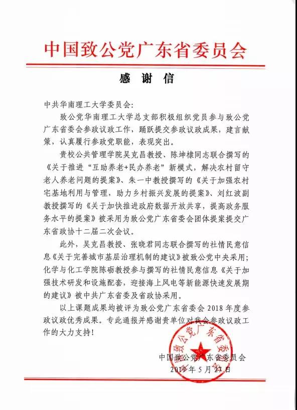 感谢信中提到,学校吴克昌教授及陈坤棣同志联合撰写的《关于推进“互助养老+民办养老”新模式,解决农村留守老人养老问题的提案》、朱一中教授撰写的《关于加强农村宅基地利用与管理,助力乡村振兴发展的提案》、刘红波副教授撰写的《关于加快推进政府数据开放共享,提高政务服务水平的提案》被采用为致公党广东省委会团体提案提交广东省政协十二届二次会议。