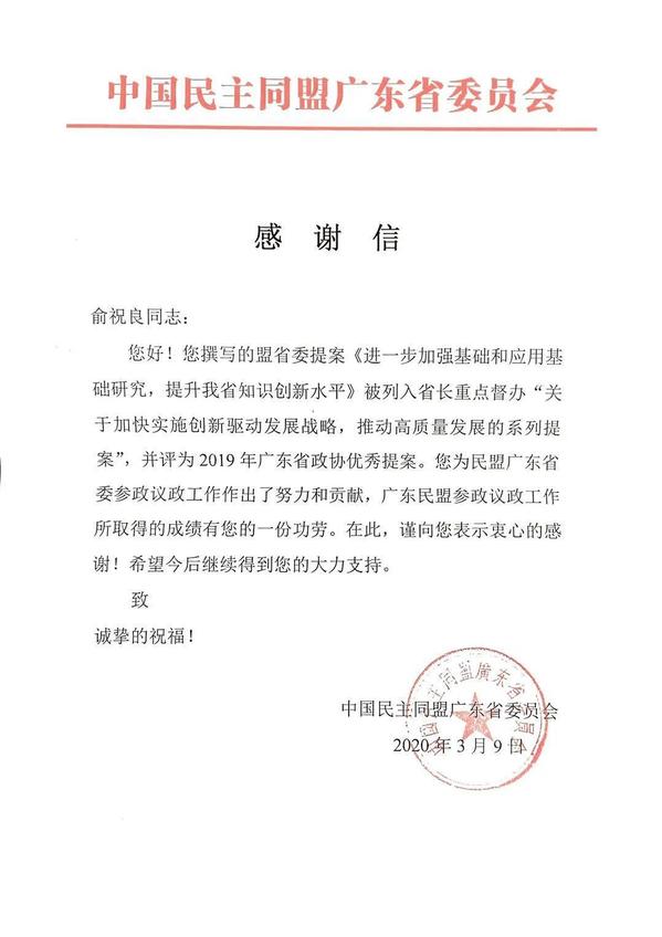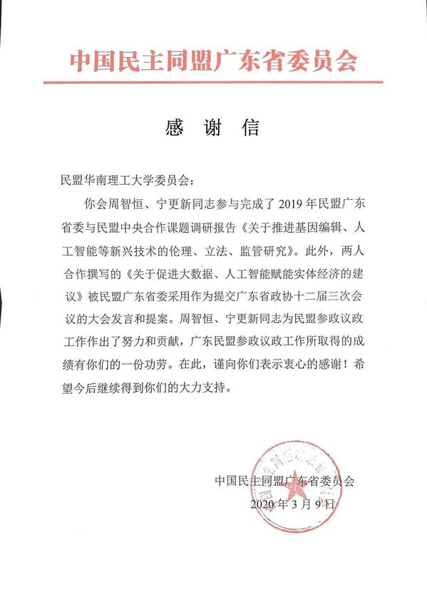 感谢信中提到,学校民盟主委俞祝良教授撰写的盟省委提案《进一步加强基础和应用基础研究,提升我省知识创新水平》被列入省长重点督办“关于加快实施创新驱动发展战略,推动高质量发展的系列提案”,并评为2019年广东省政协优秀提案。对周智恒副主委、宁更新委员参与完成的2019年民盟广东省委与民盟中央合作课题调研报告《关于推进基因编辑、人工智能等新兴技术的伦理、立法、监管研究》表示感谢;此外,两人合作撰写的《关于促进大数据、人工智能赋能实体经济的建议》被民盟广东省委采用作为提交广东省政协十二届三次会议的大会发言和提案。