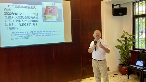 2020年5月28日,十三届全国人大三次会议审议通过了《中华人民共和国民法典》(《民法典》)。民法学博大精深、体系复杂、概念繁多、内容广泛,民法原理在我们现实生活中无处不在,“人生处处皆民法”,民法与人们的生活息息相关。为了深入学习领会《民法典》内涵深意,正确理解适用《民法典》条文精髓,加强统战成员法律和法治意识,7月10日下午,华南理工大学统一战线在民主楼会议室召开了“解读《民法典》”为主题的“同舟讲坛”。本期讲坛特别邀请了致力于民法研究的番禺区人大代表、学校民建支部副主委、法学院杨雄文教授作为主讲嘉宾。学校各级人大代表、政协委员、政府参事及无党派人士,各民主党派、统战团体负责人和成员代表参加了会议,学校党委常委、统战部部长王丹平主持会议。