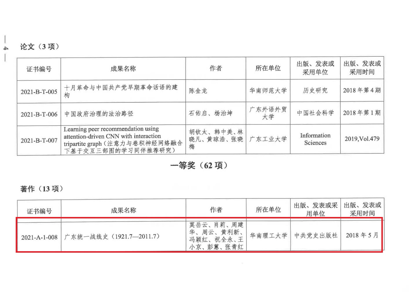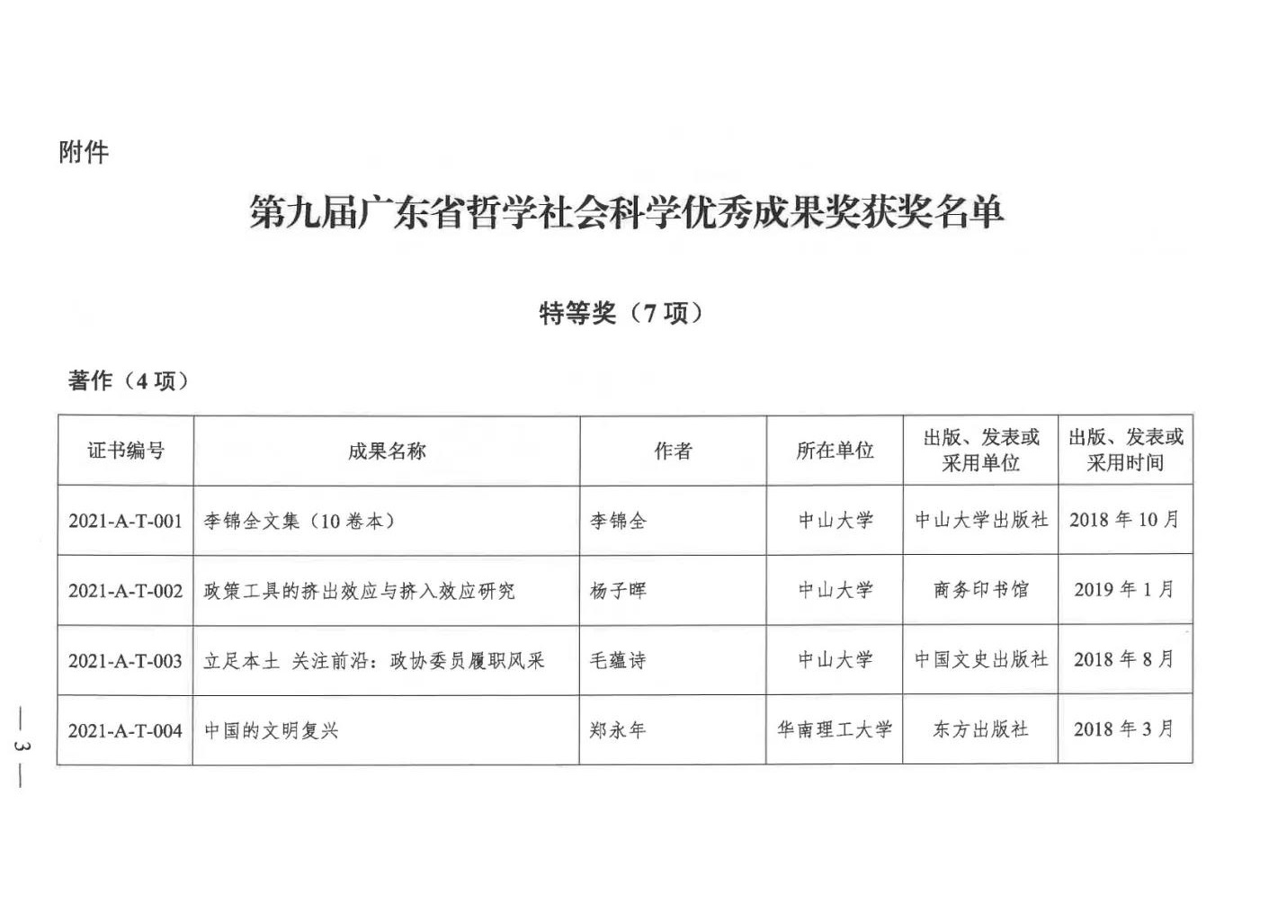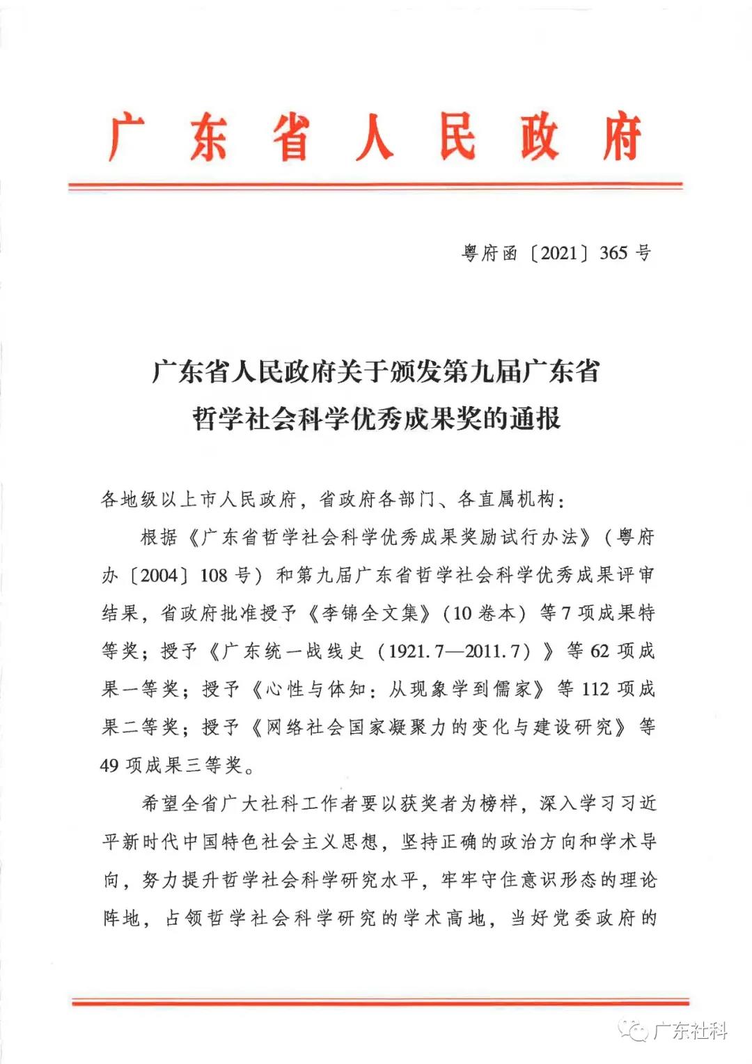 12月9日,省人民政府发布了关于颁发第九届广东省哲学社会科学优秀成果奖的通报。根据《广东省哲学社会科学优秀成果奖励试行办法》,经过申报、资格审查、评审专家遴选、初评、复评、终评、公示及异议处理、省哲学社会科学规划领导小组核准等程序,省社科联共组织评选出第九届广东省哲学社会科学优秀成果奖获奖成果230项,其中特等奖7项、一等奖62项、二等奖112项、三等奖49项。其中我校统战理论与政策研究室莫岳云老师等编著的《广东统一战线史》荣获广东省哲学社会科学优秀成果一等奖。