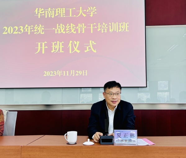 11月30日下午,华南理工大学在韶关广东南岭干部学院教学楼203课室举办2023年统一战线骨干“凝心铸魂强根基、团结奋进新征程”主题培训班开班仪式,党委统战部常务副部长夏正林出席并讲话。学校各民主党派、统战团体骨干成员、无党派人士和部分二级单位统战委员参加仪式。