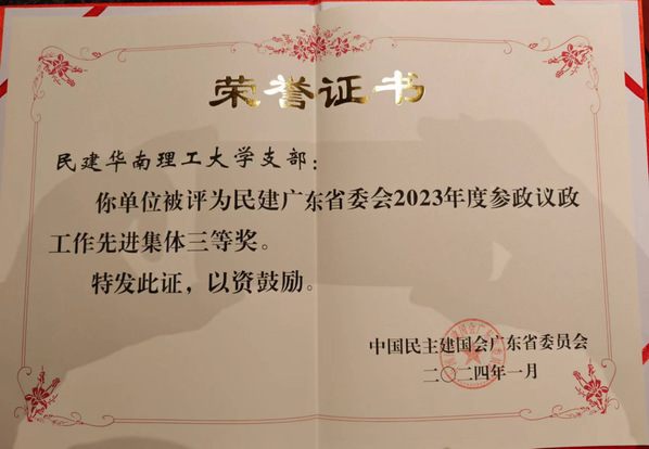 中国民主建国会广东省第十届委员会于2024年1月21日召开第三次全体会议,对2022-2023年先进集体和优秀个人进行了表彰。其中,民建华南理工大学支部被评为民建广东省委会2023年度参政议政工作先进集体三等奖;支部杨雄文主委与贺建风副主委被评为2023年度参政议政工作优秀个人。