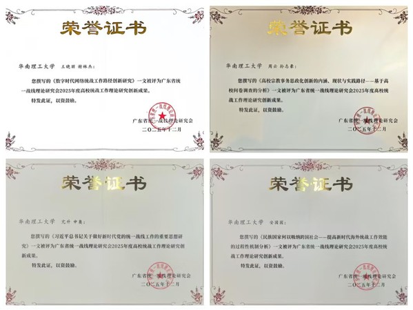 会上对2025年度高校统战工作理论研究创新成果进行了表彰。其中,华南理工大学马克思主义学院亢升教授的《习近平总书记关于做好新时代党的统一战线工作的重要思想研究》、王晓丽教授的《数字时代网络统战工作路径创新研究》、周云教授的《高校宗教事务思政化创新的内涵、现状与实践路径——基于高校问卷调查的分析》、安园园老师的《民族国家何以吸纳跨国社会——提高新时代海外统战工作效能的过程性机制分析》均获表彰。