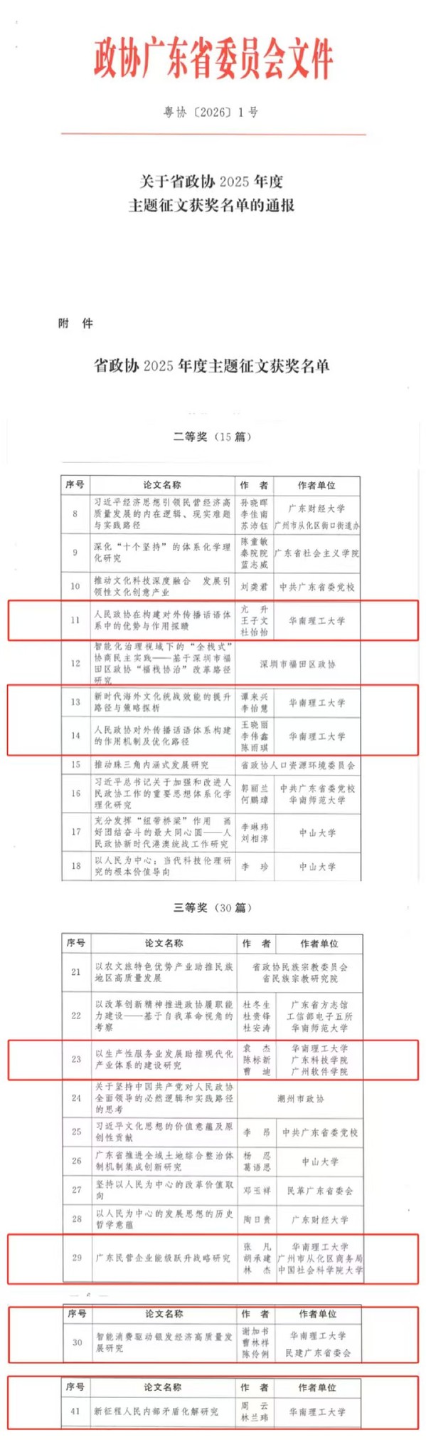 为深入学习贯彻习近平新时代中国特色社会主义思想,秉持大理论观与大研究观,强化党的创新理论学习研究,2025年省人民政协理论研究会于全省政协系统开展主题征文。华南理工大学党委统战部积极响应,组织教师踊跃参与、精心撰稿。最终,在提交的论文中7篇脱颖而出获奖,含二等奖3篇、三等奖4篇。