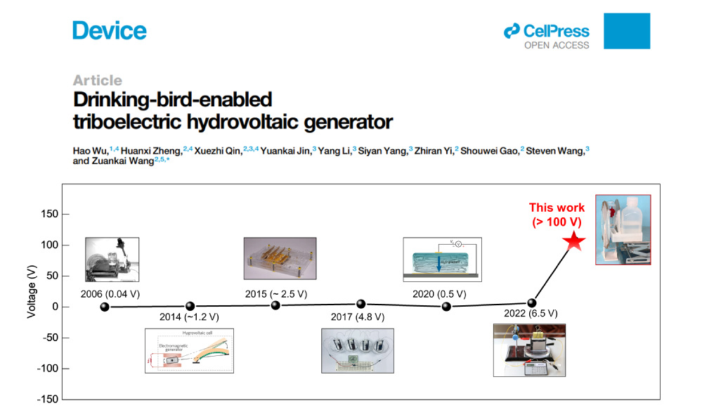 Our research: “Drinking-bird-enabled triboelectric hydrovoltaic generator” was published in Device.