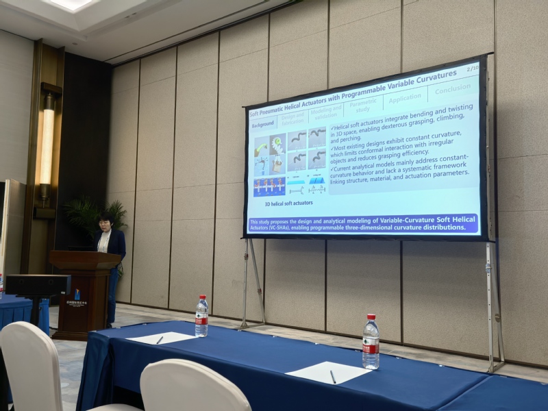 钟勇教授担任“机构与控制”分会场主席,其团队博士研究生刘浩然分享了一种可调节主动/被动部分比例的连续体驱动体鱼形推进器。并通过实验研究该比例和尾部刚度与摆动频率的动态匹配,以优化推进性能。为柔性水下推进器提供新方案。并分享了一种新型仿生电鳐机器鱼。其创新性结合MPF和BCF两种推进模式,兼具高速运动和机动性,并能够利用胸鳍实现水下物体的抓取和运输功能。