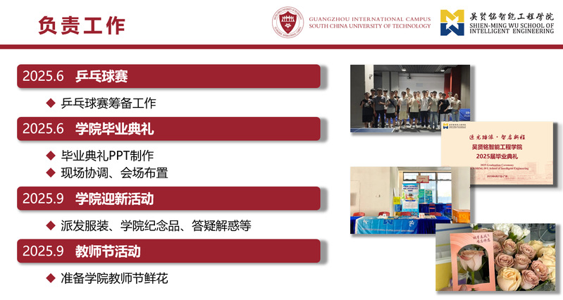 回顾过去一年,学院研究生会立足服务同学成长、助力学院发展的核心定位,依托学院深厚的科研底蕴,主动担当作为。在学术科研领域,积极协助学院成功举办第9届非线性系统与控制会议暨超级机器人国际会议、第二届“和而泰”杯机器人挑战赛、“云纵杯”超级机器人精英赛等一系列高水平活动,有效搭建了学术交流平台,为学院营造了求真务实、探索创新的浓厚学术氛围。此外,为丰富师生课余生活,学院研究生会相继策划组织了学院第一届师生羽毛球友谊赛、乒乓球赛等文体活动,举行庄重的升旗仪式,以多元形式凝聚师生情感;同时完成学院2025年毕业典礼、2025级新生迎新等重点工作,在细致服务中践行责任担当,为学院高质量发展贡献了青春力量。