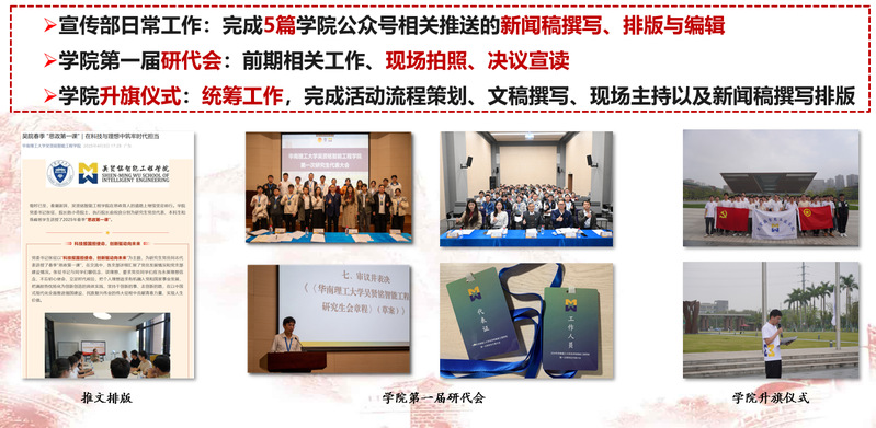 为进一步深化研究生会组织建设效能,系统总结过往工作经验,明确新学期的工作方向和发展建设目标,11月7日下午,吴贤铭智能工程学院研究生会顺利召开2024-2025学年述职评议会。本次会议由研会主席团成员韦一主持,学院研究生辅导员洪鑫老师、研究生会全体成员及部分学生代表共同参会。