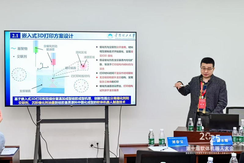 钟勇教授在”仿生软体机器人驱感一体化技术研究”报告中,针对传统分立式制造导致的集成难题,提出了基于嵌入式3D打印与催化剂扩散的“打印-固化”一体化制造新方法。该技术突破了材料与结构限制,实现了多功能材料的原位集成与复杂结构一体化成型,为智能软体机器人的高效制造提供了创新路径。