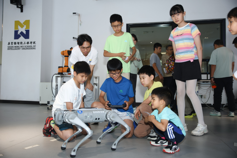 After the lecture, students and parents visited the Shien-Ming Wu School of Intelligent Engineering for a technology-filled exploration. The institute held an enrollment promotion event, delving into the unique features and professional strengths of the institute, while also conducting popular science education on cutting-edge technologies, guiding everyone to explore the boundless possibilities in the field of intelligent engineering. Visitors experienced a cyber zoo up close, encountering a robotic fish that swims without gills, a robotic dog that runs without a heart, and a robotic bird that flies without feathers.