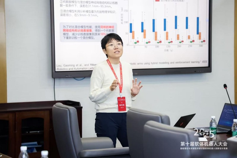 In her presentation on Physics-DataHybrid Modeling and Reinforcement Learning Control for Soft Robots,Associate Professor Zhou Yitong systematically analyzed the limitations of traditional modeling approaches and proposed a new hybrid method that integrates physical models with data-driven techniques. Focusing on asix-degree-of-freedom soft robotic arm, she further introduced a reinforce mentlearning control strategy based on an inverse kinematics model, effectively improving modeling accuracy and control efficiency.