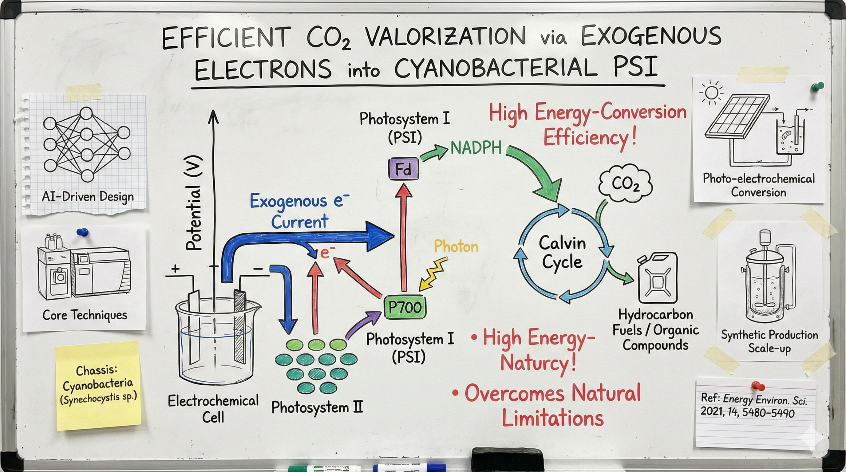 我们正在开发一种混合型生物电化学系统,用于实现二氧化碳的高效增值转化。该系统将外源电流直接导入蓝藻光合系统I以驱动二氧化碳固定过程,从而达成极高的能量转化效率。这种电驱光合作用能够生产出比人工光合作用产物结构更为复杂的碳氢燃料,同时强化碳代谢关键基因产物的合成。通过将外部电子或还原态单碳代谢物与光能相结合,该设计突破了天然光合作用的能量转化局限,为将二氧化碳转化为高价值有机化合物提供了稳定高效的路...