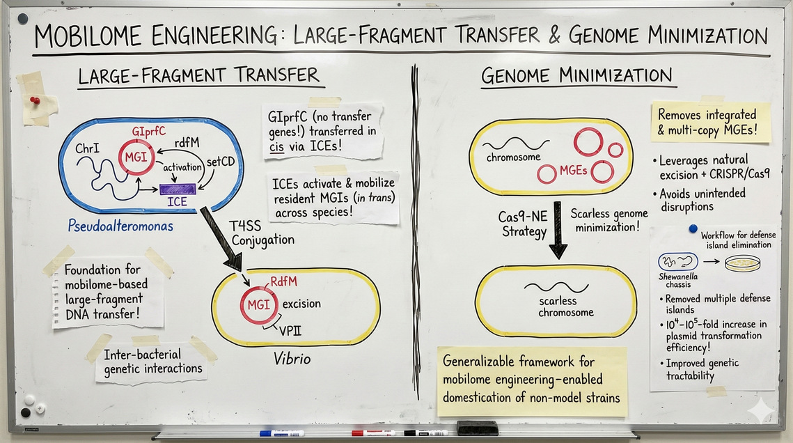 我们长期致力于探究细菌间遗传相互作用的机制。在假交替单胞菌研究中,我们发现基因组岛GIprfC虽缺乏典型的转移基因,却可通过与整合接合元件(ICEs)的顺式串联整合实现转移。进一步研究发现,ICEs能激活并驱动定植于基因组内的可移动基因组岛(MGIs),实现跨物种的反式转移。这些发现为基于移动基因组的大片段DNA转移机制奠定了理论基础。为实现精准的基因组精简,我们开发了Cas9-NE策略。该策略能同步清除整合态与多拷贝环状形...