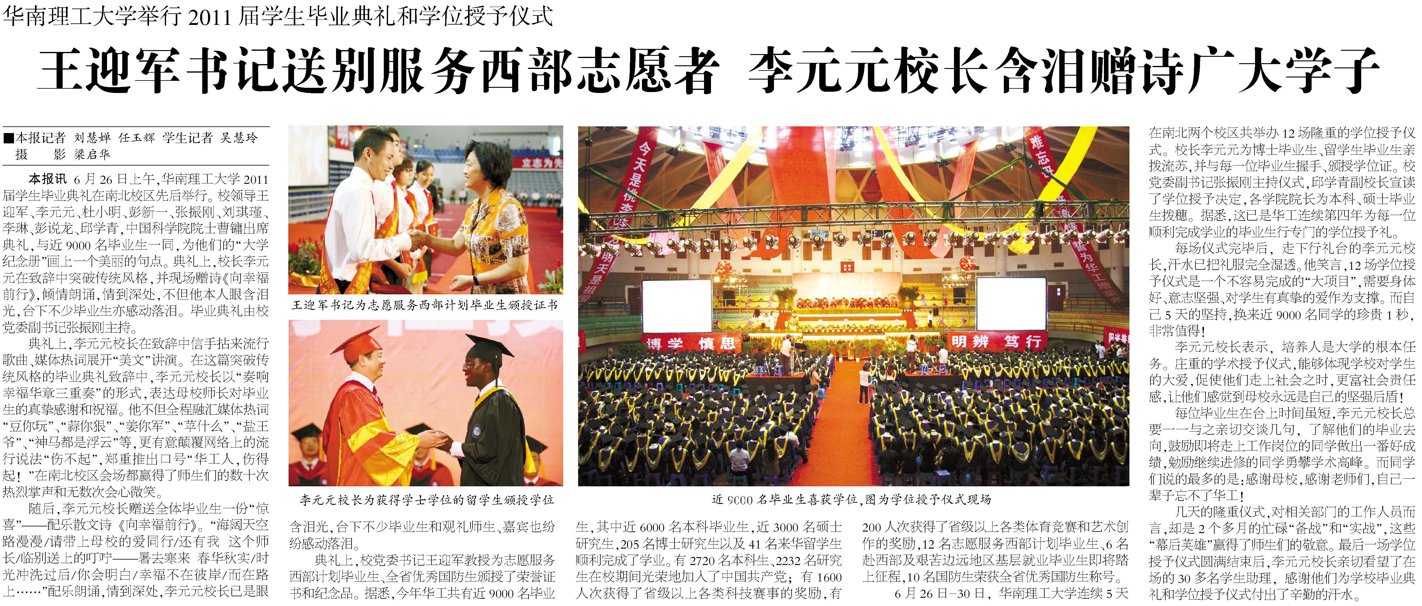 2011年6月26日华南理工大学举行2011届学生毕业典礼和学位授予仪式,王迎军书记送别服务西部志愿者,李元元校长含泪赠诗广大学子