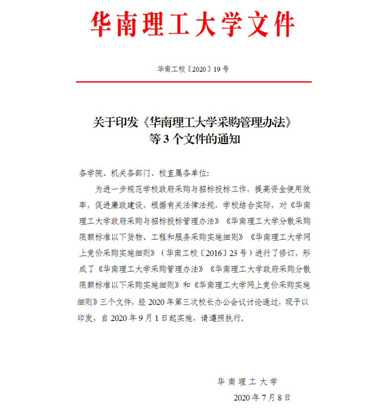华南理工大学网上竞价采购实施细则(2020年修订)【华南工校〔2020〕19号】(2020年9月1日实施)