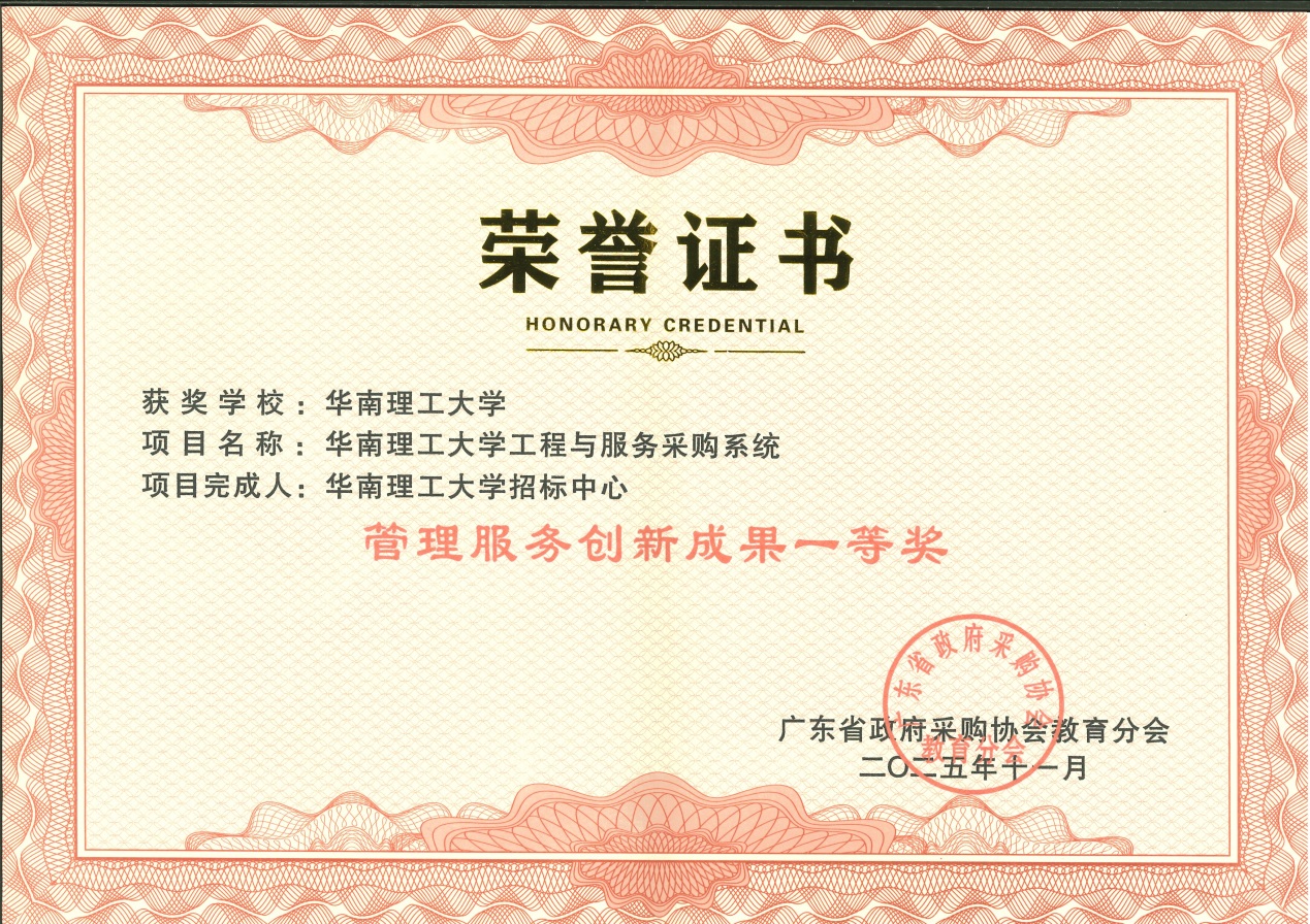 同期,广东省政府采购协会教育分会评选并表彰了2025年度在政府采购领域中表现优秀的集体和个人,我校以《华南理工大学工程与服务采购系统 》案例分析获评“管理服务创新成果一等奖”,招标中心曾琦锴获评“高校采购工作先进个人”。