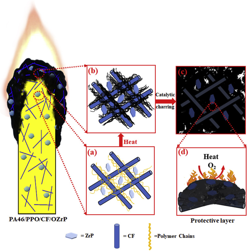 Combination effect of zirconium phosphate nanosheet and PU-coated carbon fiber on flame retardancy and thermal behavior of PA46/PPO alloyJincheng Ran, Jiedong Qiu, Huali Xie, Xuejun Lai*, Hongqiang Li, Xingrong Zeng* Abstract: How to effectively enhance the flame retardancy of polyamide 46/polyphenylene oxide (PA46/PPO) alloy is one of the key issues needed to be addressed. In this work, organic-modified zirconium phosphate (OZrP) nanosheet was incorporated with PU-coated carbon fiber (CF) to flame-retard PA46/PPO alloy. The combination of OZrP and CF showed an outstanding combination effect in improving the flame retardancy and thermal stability of PA46/PPO. With the incorporation of 2 wt% OZrP and 20 wt% CF, the peak heat release rate and peak smoke production rate of PA46/PPO were reduced by 65.6% and 86.2%, respectively. Besides, the Ti (temperature at 5% weight loss) and the residue of PA46/PPO/OZrP/CF were increased by 13.2 °C and 20.9 wt%, respectively, compared with PA46/PPO. The flame-retardant mechanism was further studied and revealed: when being burned, CF acted as the skeleton to improve the strength of char; simultaneously, OZrP catalyzed the carbonization of the polymer chains on the CF surface to form a strong and compact protective char layer, which blocked the transmission of heat and combustible gases, thus effectively improved the flame retardancy of the composite.