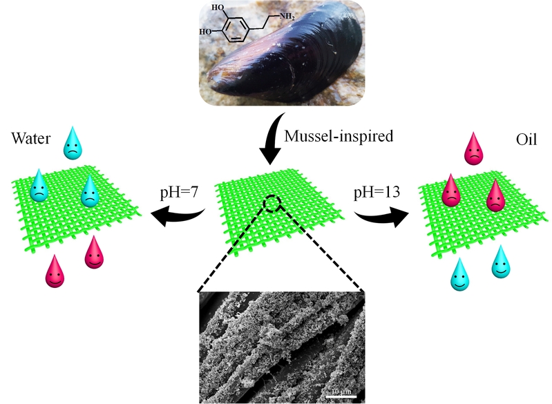 Mussel-inspired cotton fabric-based membrane with pH-responsive superwettability for bidirectional oil-water separation Xiaofeng Liao, Hongqiang Li*, Xiaojing Su, Haomiao Zhan, Xuejun Lai, Xingrong Zeng* Abstract: With the deteriorating environmental pollution by oil spill accidents and industrial sewage emissions, stimuli-responsive superwettable materials have been of considerable interest for its intriguing application in oil-water separation. Herein, we report a facile room-temperature method to fabricate mussel-inspired cotton fabric-based membrane with pH-responsive superwettability, by combining in-situ generation of silver particles to construct roughness with self-assembly of long alkyl thiols terminated with methyl and carboxyl groups to endow hydrophobicity and responsiveness. The fabricated pH-responsive membrane showed superhydrophobicity with water contact angle (WCA) up to 153o under acidic and neutral conditions while superhydrophilicity with WCA at 0o under alkaline condition. Importantly, the membrane was successfully applied in bidirectional oil-water separation, exhibiting high separation efficiency and excellent reversibility. Furthermore, the pH-responsive membrane also demonstrated superior self-cleaning property and antibacterial activity to E. coli and S. aureus. Our method to construct pH-responsive membrane is simple, and no special techniques, chemicals or control of atmosphere is required. Our findings conceivably stand out as a new tool to fabricate functional superwettable membranes and surfaces with responsiveness to external stimuli for various oil-pollution treatments and other potential applications.