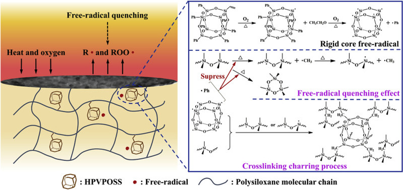 Effect and mechanism of hepta-phenyl vinyl polyhedral oligomeric silsesquioxane on the flame retardancy of silicone rubberTongyi Wu, Jiedong Qiu, Xuejun Lai*, Hongqiang Li, Xingrong Zeng* Abstract: It is challenging to simultaneously improve the flame retardancy and mechanical properties of silicone rubber. We herein proposed an efficient method to address this issue by incorporating hepta-phenyl vinyl polyhedral oligomeric silsesquioxane (HPVPOSS) into addition-cure liquid silicone rubber (ALSR). HPVPOSS meanwhile enhanced the flame retardancy and thermal stability of ALSR. With the addition of 10 phr HPVPOSS, ALSR passed the V-0 rating in the vertical burning test (UL-94) and had a limiting oxygen index (LOI) value as high as 31.0%. Moreover, compared with ALSR, the peak heat release rate and total heat release were decreased by 31.8% and 28.7%, respectively. Besides, the ALSR/HPVPOSS nanocomposites were demonstrated to have excellent mechanical properties. The possible flame retardant mechanism of HPVPOSS, which was attributed to the free-radical quenching effect and the catalysis effect on the crosslinking charring of ALSR, was further revealed. By generating the rigid core free-radicals and phenyl free-radicals, HPVPOSS suppressed the thermal degradation of ALSR in the condensed phase and quenched the active free-radicals in the gas phase. Moreover, HPVPOSS promoted the crosslinking charring of ALSR and the formation of a compact ceramic protection layer on the ALSR surface, effectively hindering the heat transfer and oxygen diffusion. Our findings provided a new way to fabricate silicone rubber with prominent flame retardancy and outstanding mechanical properties.