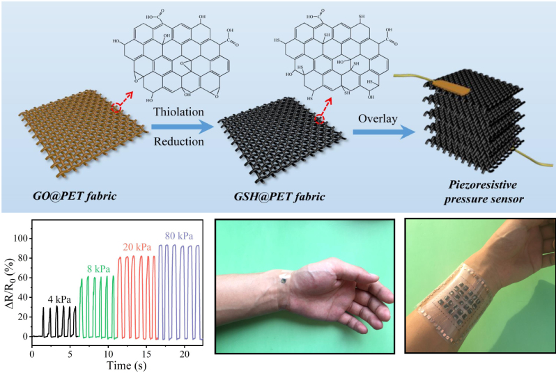 Thiolated graphene@polyester fabric-based multilayer piezoresistive pressure sensor for detecting human motionsLin Zhang, Hongqiang Li*, Xuejun Lai, Tianyuan Gao, Jian Yang*, Xingrong Zeng* Abstract: In the past several years, wearable pressure sensors have arisen the new surge of interest worldwide due to their important applications in the areas of health monitoring, electronic skin and smart robots. However, it is still a great challenge to simultaneously achieve wide pressure sensing range and high sensitivity for the sensors until now. Herein, we proposed an innovative strategy to construct multilayer-structure piezoresistive pressure sensors with in situ generated thiolated graphene@polyester (GSH@PET) fabric via one-pot method. Taking advantages of the spacing among the rough fabric layers and the highly conductive GSH, the sensor realized not only wide pressure range (0-200 kPa), but also high sensitivity (8.36 and 0.028 kPa-1 in the ranges of 0-8 and 30-200 kPa, respectively). After 500 loading-unloading cycles, the sensor still kept high sensitivity and stable response, exhibiting the great potential in long-term practical application. Importantly, the piezoresistive pressure sensor was successfully applied to accurately detect different human behaviors including pulses, body motions and voice recognitions. Additionally, the sensing network integrated by the sensors also realized mapping and identifying spatial pressure distribution. Our method to construct the wide-range and high-sensitivity piezoresistive pressure sensor is facile, cost-effective and available for mass production. The findings provide a new direction to fabricate the new-generation high-performance sensors for healthcare, interactive wearable devices, electronic skin and smart robot.