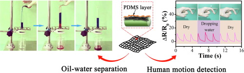 Conductive superhydrophobic cotton fabrics via layer-by-layer assembly of carbon nanotubes for oil-water separation and human motion detectionLongzhu Zheng, |Xiaojing Su, Xuejun Lai, Wanjuan Chen, Hongqiang Li*, Xingrong Zeng* Abstract: Conductive superhydrophobic cotton fabric was fabricated by assembling carboxylated and aminated multiwalled carbon nanotubes and modifying with polydimethylsiloxane. The cotton fabric possessed superhydrophobicity with a CA of 162°, and was successfully applied in oil-water separation with high separation efficiency and great reusability. Additionally, the conductive fabric-based pressure sensor exhibited stable and regular responses in human motion detection including finger bending, wrist movement, walking and running. Owing to the excellent water repellency of the fabric, the pressure sensor could work even under wet and humid conditions, which may pave a novel way to further broaden application field in high-performance electric sensors.
