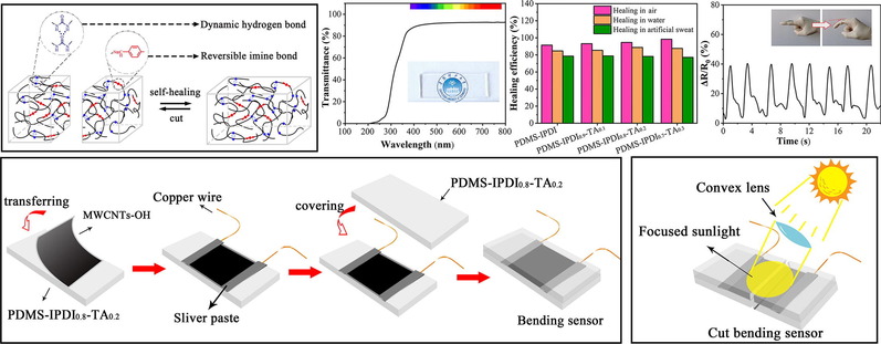 Highly Stretchable, Transparent and Room-temperature Self-healable Polydimethylsiloxane Elastomer for Bending SensorZhipeng Yang, Hongqiang Li*, Lin Zhang, Xuejun Lai, Xingrong Zeng* Abstract: Highly stretchable and self-healable elastomers are attractive for a variety of applications in the fields of electrical skin and wearable devices. Herein, we proposed a simple one-pot two-step approach to synthesize room-temperature self-healable polydimethylsiloxane (PDMS) elastomers. Excess aminopropyl terminated polydimethylsiloxane was firstly reacted with isophorone diisocyanate to synthesize amino-terminated PDMS with incorporated ureido groups, followed by further reaction with terephthalaldehyde as chain extender to yield self-healing PDMS elastomers. The obtained elastomer exhibited high stretchability of 1670% and transmittance of 92%. Owing to the dynamic intermolecular hydrogen bonds, reversible imine bonds and highly flexible SiO chains, the elastomer showed excellent self-healing capability with a healing efficiency of 95% after healing at room temperature for 24 h. Even in water and artificial sweat, the healing efficiencies also reached 89% and 78%, respectively. In addition, the elastomer supported triple-layer bending sensor was fabricated with a sandwiched hydroxylated multiwalled carbon nanotubes (MWCNTs-OH) film and successfully applied for detecting human motions. Interestingly, the cut sensor was able to be recovered for working after being irradiated under sunlight for only 10 min. Our method to synthesize highly stretchable, transparent and self-healing elastomers is simple and the reaction can be carried out at room temperature, which is beneficial for the large-scale production and the further practical application in functional electronics.