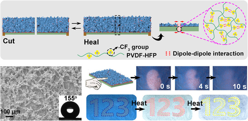 Bioinspired superhydrophobic thermochromic films with robust healabilityXiaojing Su, Hongqiang Li*, Xuejun Lai, Longzhu Zheng, Zhonghua Chen, Songshan Zeng, Kuangyu Shen, Luyi Sun*, Xingrong Zeng* Abstract: Thermochromic films with intriguing functionalities have great potential in soft actuators, heat storage devices, and interactive interface sensors. Inspired by the unique features of bird feathers (such as Nicobar pigeon, Anna hummingbird, mandarin duck, etc.), a superhydrophobic thermochromic film (STF) with robust healability is proposed for the first time through sandwiching an electric heater between a top thermochromic layer and a bottom poly(vinylidene fluoride-co-hexafluoropropylene) (PVDF-HFP) substrate. The STF exhibits fast and reversible color conversions of blue-pink-yellow under a low input power and has a superhydrophobic property with a contact angle of 155°. Furthermore, owing to the strong dynamic dipole–dipole interactions between the polar CF3 groups of flexible PVDF-HFP chains, the STF possesses a robust healing capability of structure and conductivity. By means of the temperature difference generated by the objects contacting (finger, iron, and water) as a stimulus, the STFs achieve tactile imaging and writing record with advantages of transient display, automatic erasure, and excellent reusability. Additionally, the STF-based anti-counterfeiting security labels with superhydrophobicity and three-state color switching simultaneously realize facile distinguishment and difficult forgery. The findings conceivably stand out as a new methodology to fabricate functional thermochromic materials for innovative applications.